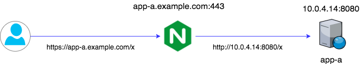 Here app-a is hosted on 10.0.4.14 and serves on port 8080. In this example, we use a static IP, but you can use a subdomain, e.g. app-a.private.example.com, or an internal (VPC-facing) load balancer.